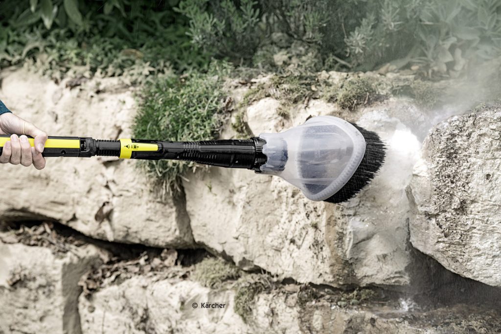 Sollen kleinere Abschnitte oder Treppenstufen wieder sauber werden oder wird entlang von Kanten und in Ecken gereinigt, hilft ein Powerschrubber. Mit drei Hochdruckdüsen wird hartnäckiger Schmutz besonders kraftvoll entfernt.